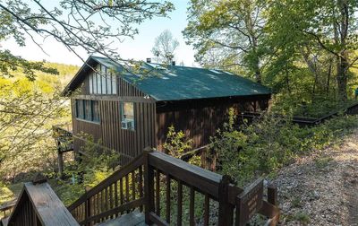 Each Hilltop building contains four individual cabins: Two on each level which can connect via a door on the private screened in porches. The King Hilltop features 1 king bed with a twin daybed in the living room area of the suite style unit. Each cabin has a private bath and a stone fireplace. Min 2 persons p/night and Max 3 persons. Dog friendly.